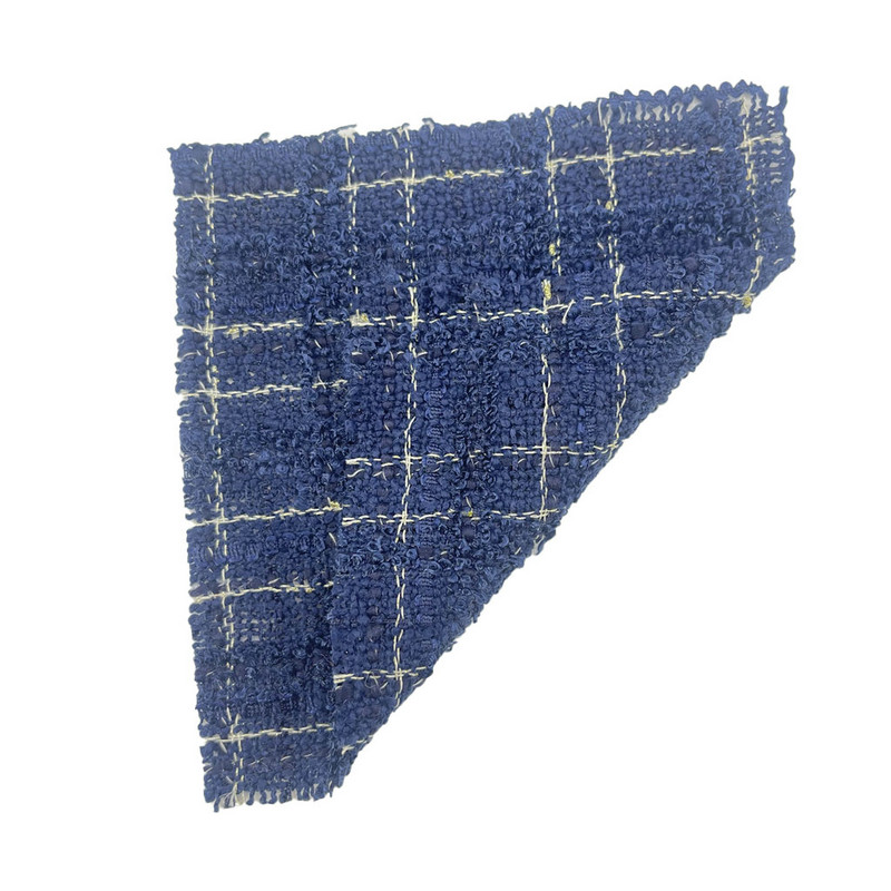 Táto látka, označená ako artikel 19909-10, je 100% polyesterový tvíd určený pre dámske oblečenie. S hmotnosťou na jednotku plochy 558 g/m predstavuje stredne ťažkú štruktúru. Tmavomodrý základ je tkaný kockovaným vzorom, ktorý je počas výrobného procesu integrovaný do metalickej priadze. Táto kombinácia vytvára kontrast vo vizuálnych aj hmatových vlastnostiach. Celopolyesterové zloženie zaisťuje rozmerovú stálosť a konzistentný výkon. Zahrnutie kovových prvkov dodáva textilnému povrchu detaily odrážajúce svetlo. Vďaka týmto vlastnostiam je látka vhodná pre odevy, kde je prioritou štrukturálna integrita a dekoratívny efekt.